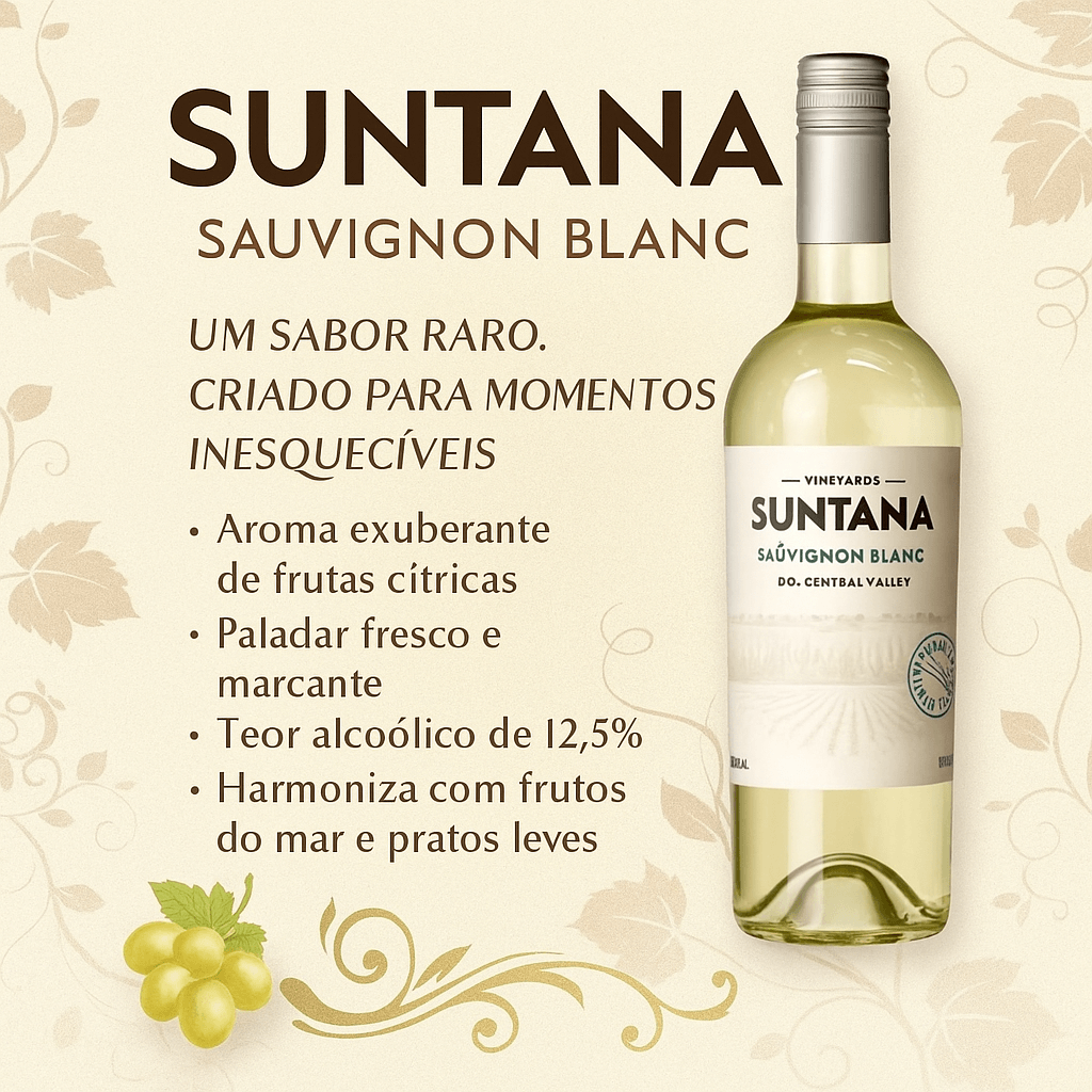 O Suntana Sauvignon Blanc é um vinho branco vibrante e refrescante, produzido no coração do Valle Central do Chile. Com aromas frutados e acidez equilibrada, ele é perfeito para dias ensolarados, encontros descontraídos e harmonizações com pratos leves, trazendo frescor e leveza a cada gole.