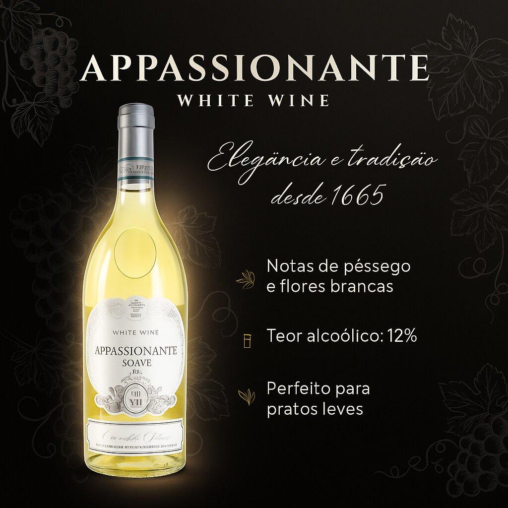 O Appassionante Soave DOC é um vinho branco de alta qualidade, produzido na tradicional região de Soave, no Vêneto. Elaborado com uvas Garganega, a principal uva da região, esse vinho é uma verdadeira expressão do frescor e da elegância italianos, ideal para quem busca um vinho suave e refrescante para diversos momentos.