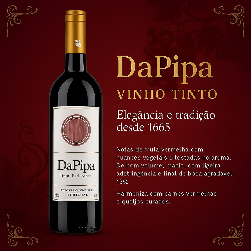 DaPipa representa o lado descomplicado e acolhedor do vinho português. Produzido com tradição e cuidado, é perfeito para momentos simples ou para acompanhar refeições com boas conversas.