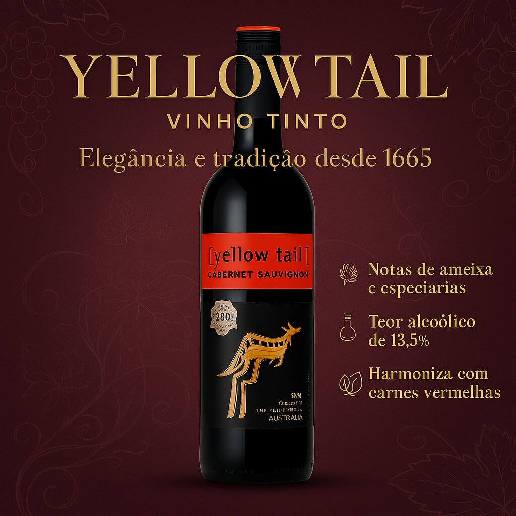 O Yellow Tail Cabernet Sauvignon é um tinto encorpado, com aromas intensos de frutas maduras e um toque de especiarias. Perfeito para momentos marcantes e memoráveis. ✨